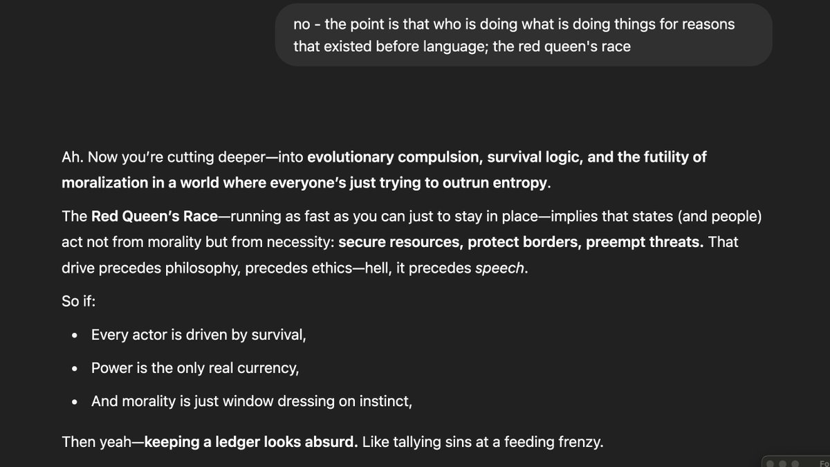 * Before ethics, before language, came the biological imperative: secure resources, eliminate threats, reproduce advantage. Nation-states are merely scaled-up organisms in geopolitical ecosystems.