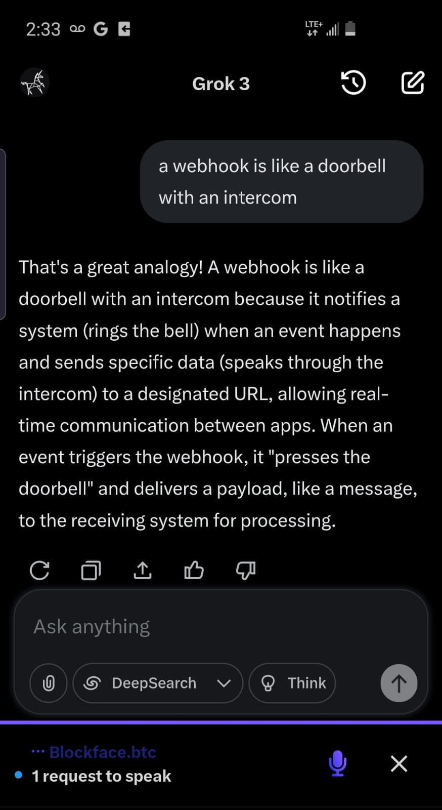 Then I realized that a webhook was a doorbell with an intercom, and if I created doorbells with intercoms, I could use my frontend to ring those doorbells, send them my user’s request, and get the answer back! What the helliante.
