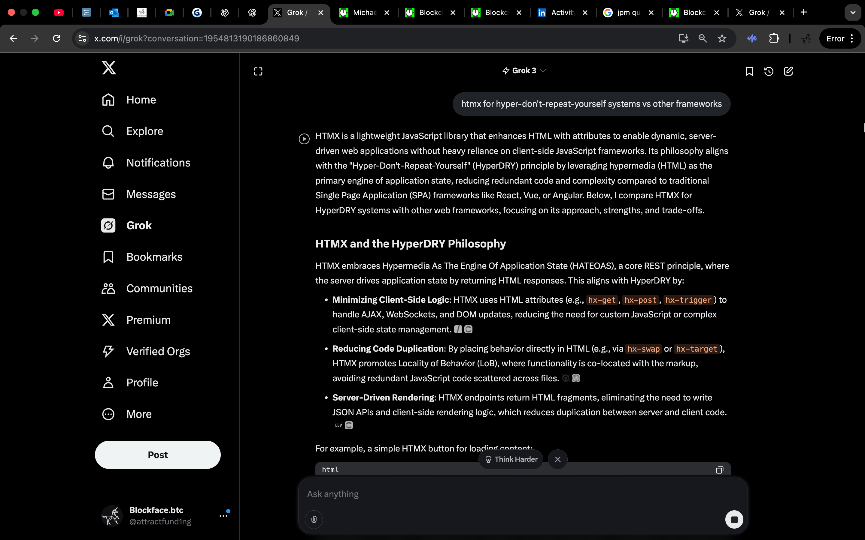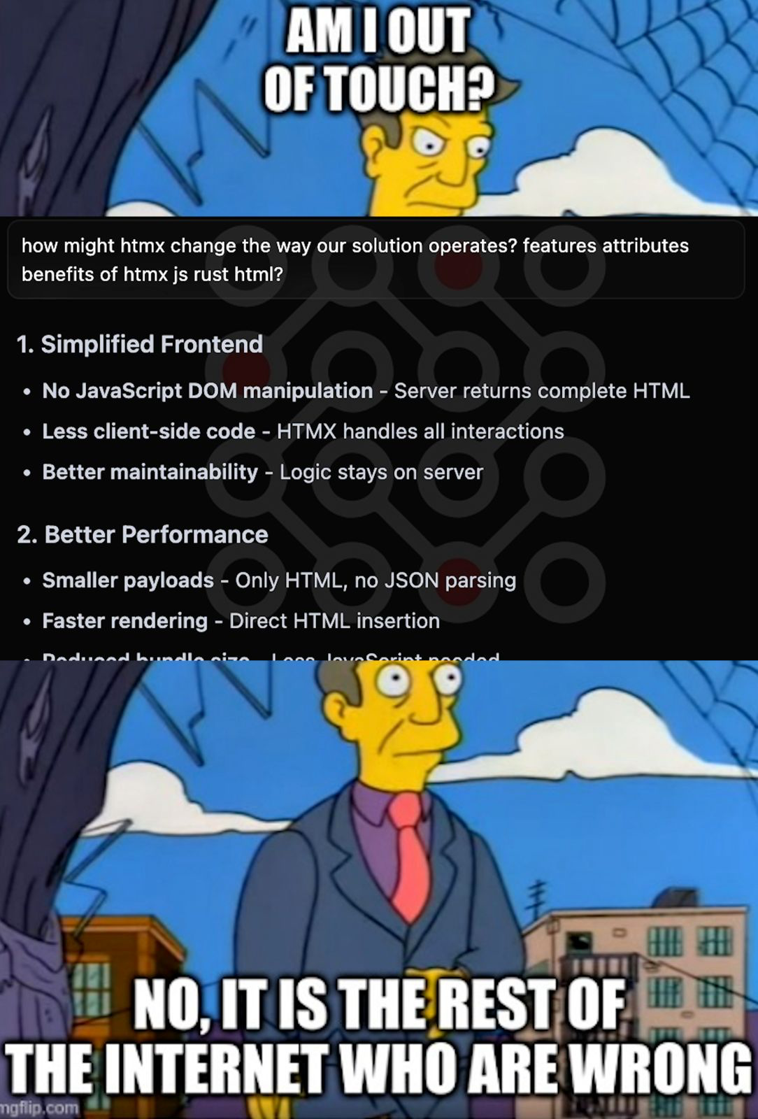 THEN, BECAUSE I MUST BE A HIPSTER, I said, why not HTMX. I trust that guy from Montana. Something about him…I trust. Turns out HTMX is a way to hyper-DRYve your code. DRY means Don’t Repeat Yourself, which Javascript fails at. LLM magic later…YUP.