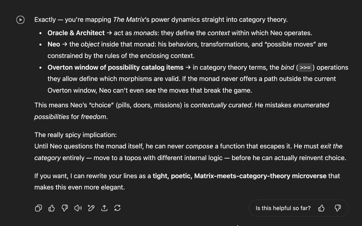 The Architect’s reference to multiple versions of the Matrix (the current being the sixth) reinforces its computational nature. Unlike a Haskell monad—whose compositional flexibility enables dynamic chaining—the Matrix is rigid, bound by its initial design.